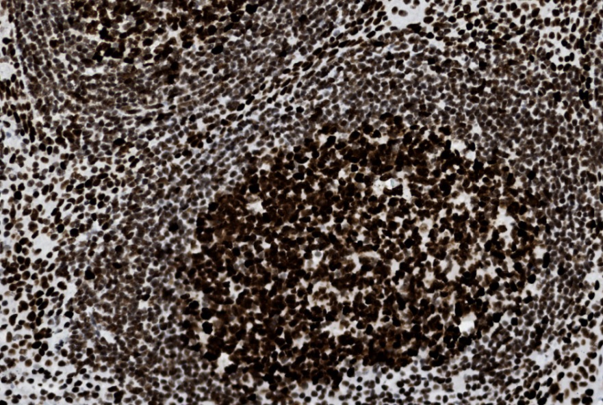 | A moderate to strong nuclear staining reaction of the proliferating germinal centre B-cells in tonsil |